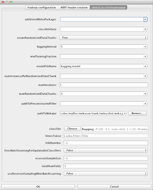 - More text mining stuff. SGDText and NaiveBayesMultinomialText can already be used in version 1.0 of the distributed packages. Weka's StringToWordVector filter really needs an option to allow a dictionary to be supplied by the user. Once this is done, we could have a job to create a dictionary (and IDF counts) - basically just a modification of the classic word count MR job - and then use the StringToWordVector filter as normal.